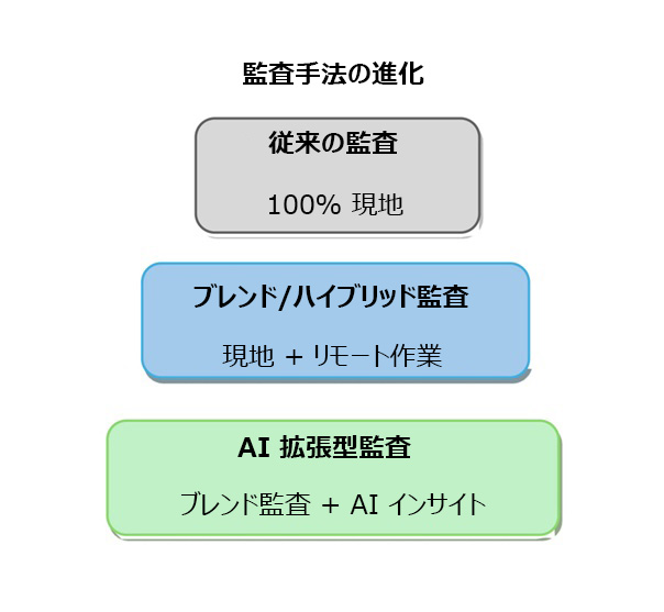 AIが分析能力を高める一方で、人間の判断が最終的な権威であることに変わりはありません。監査員は、AIのスピード、一貫性、追跡可能性と、対面での状況把握と検証、そしてリモートでのデータに基づいた豊富な分析とのバランスを取りながら、ブレンド監査の環境で活用します。